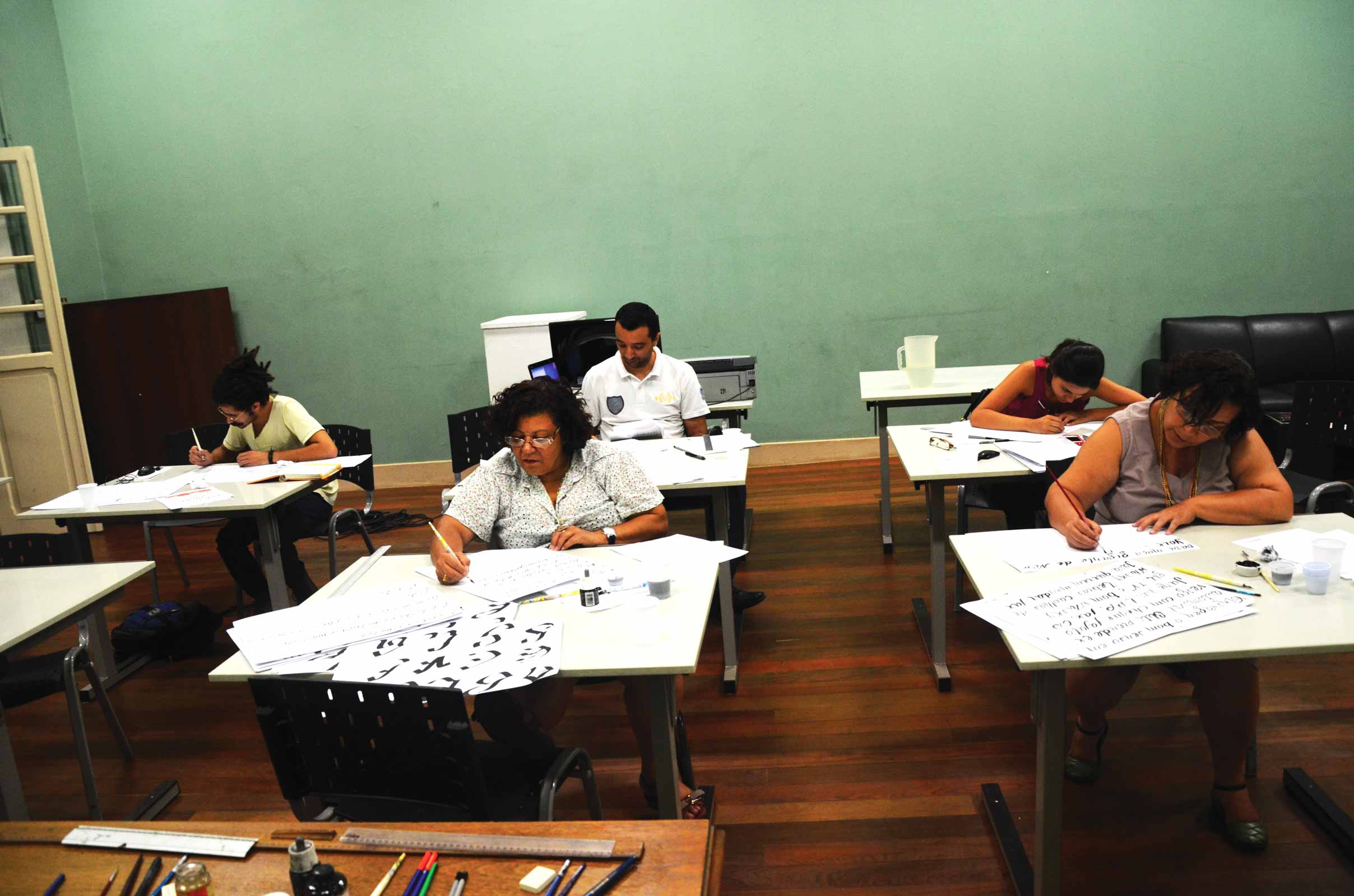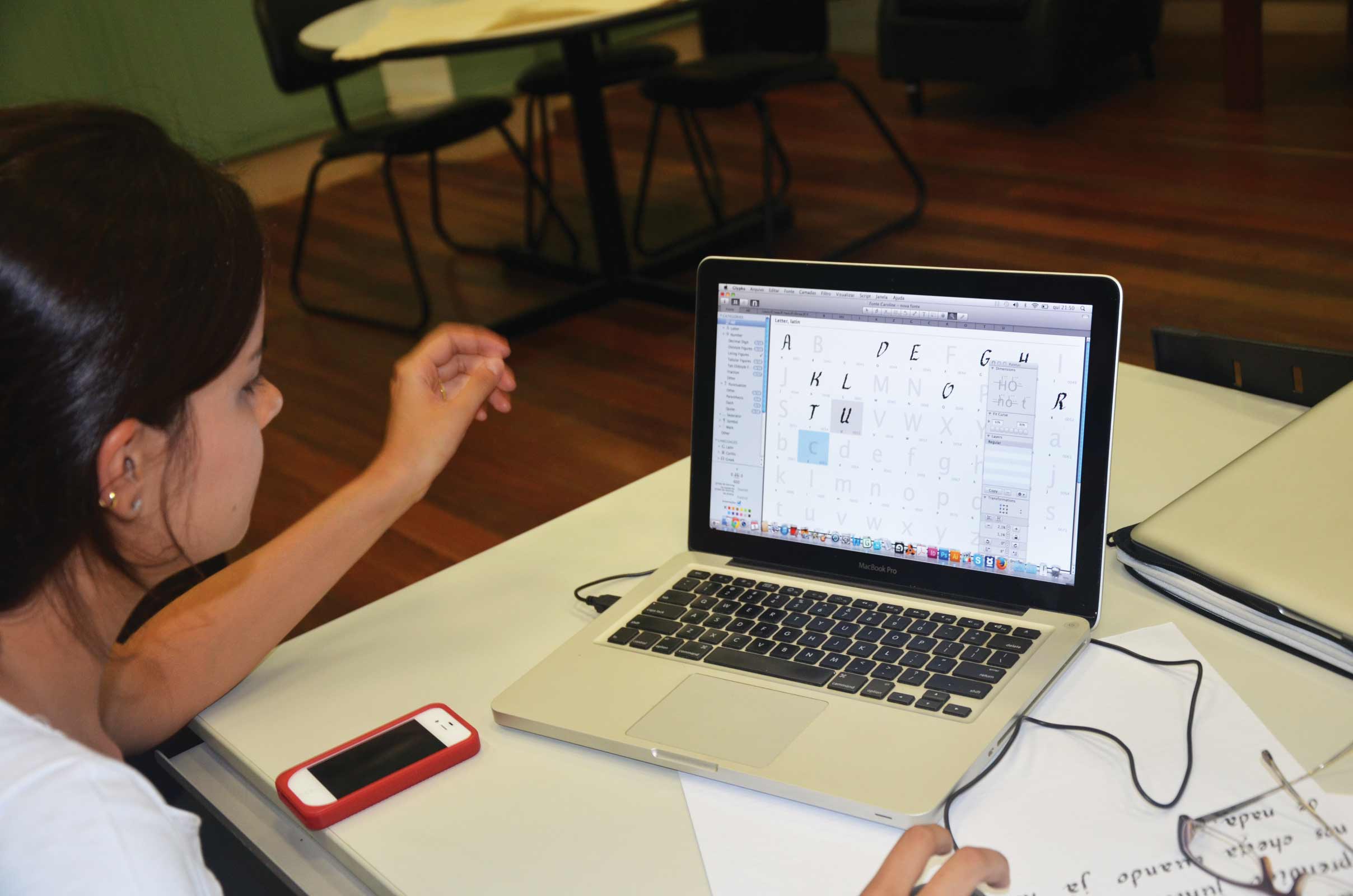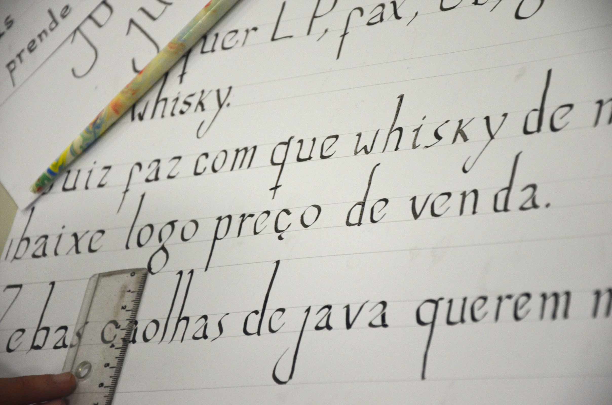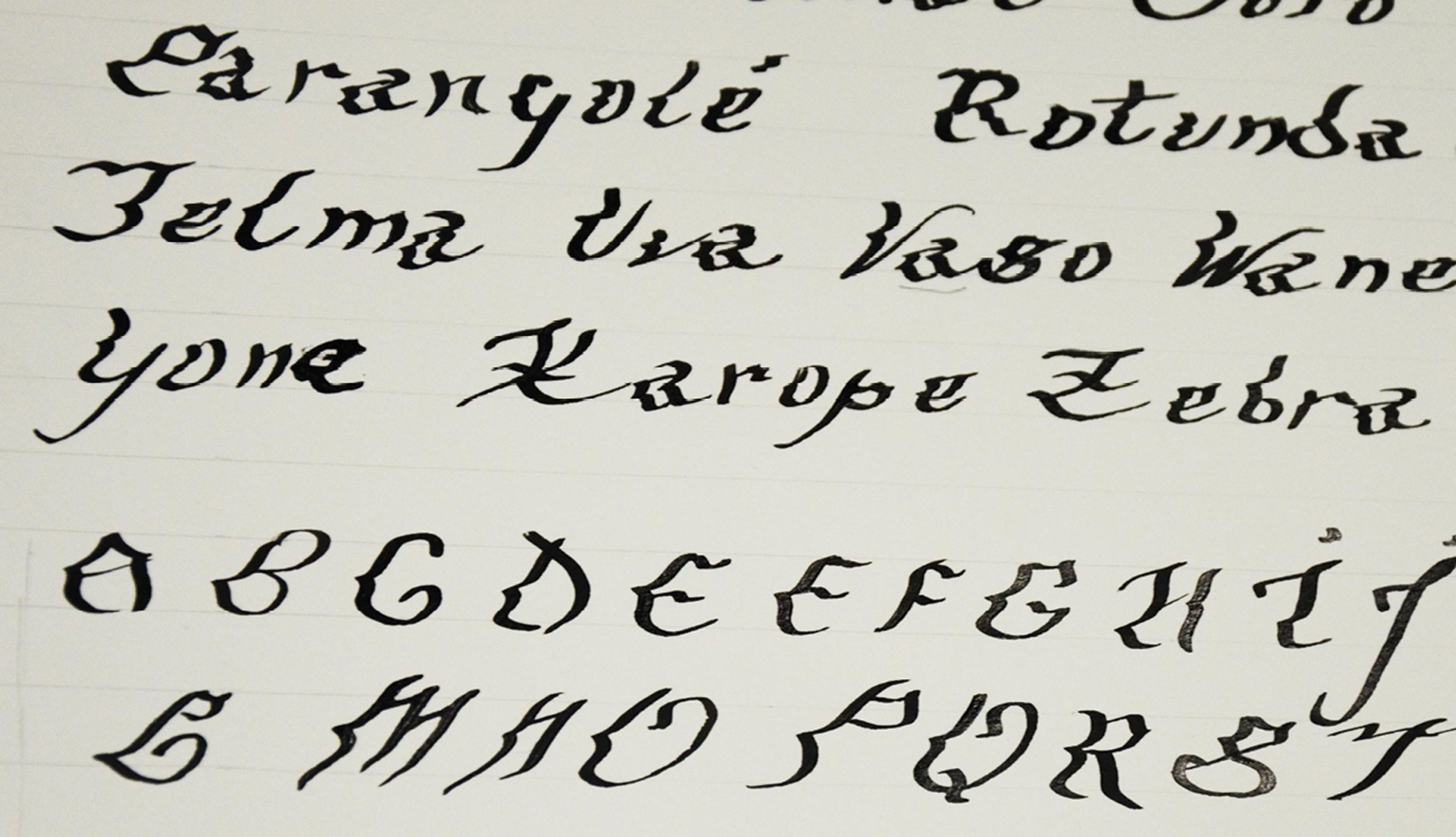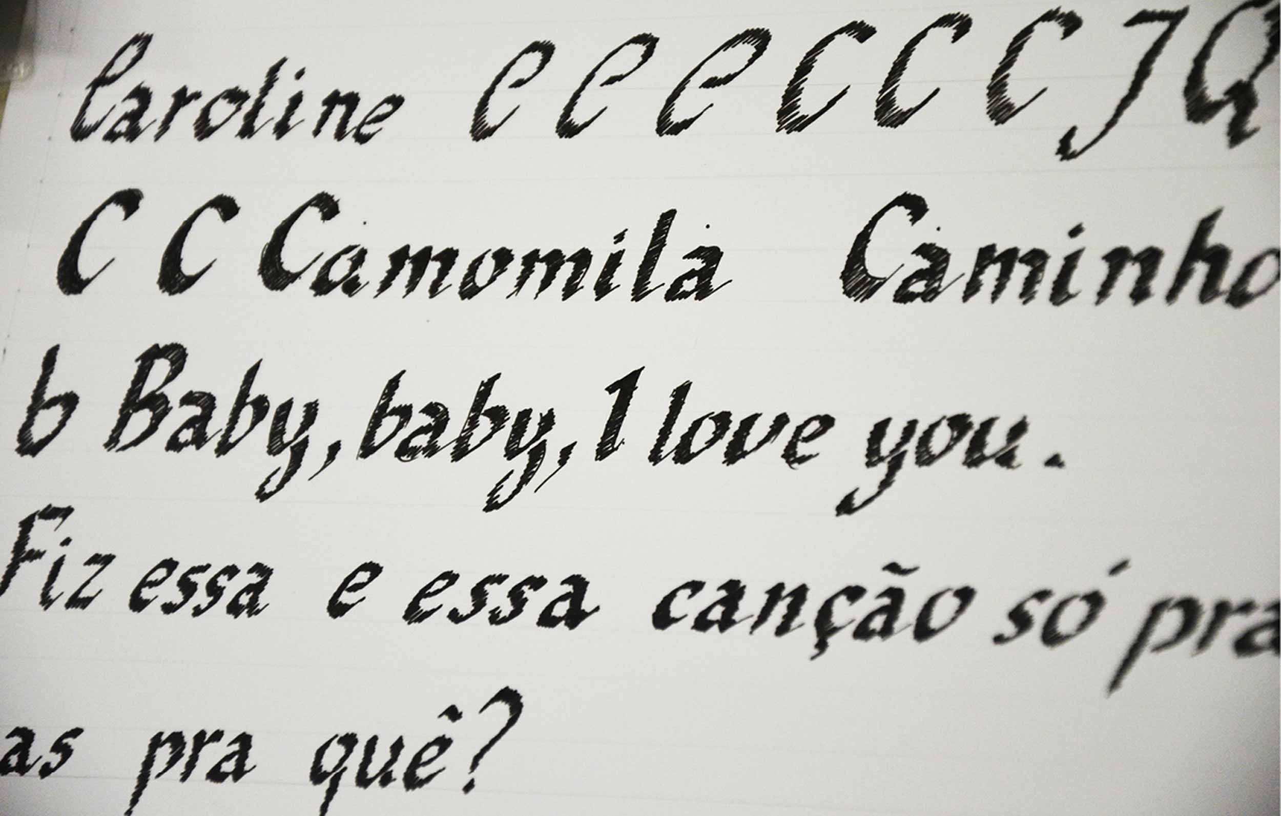 Em dezembro de 2013, conduzi uma oficina de Design de Tipos no Centro Cultural UFMG, onde participantes exploraram diferentes ferramentas a fim de criar uma fonte a partir da escrita manual. Focando no gesto, exploramos como a tipografia, apesar de domesticar o alfabeto, oferece possibilidades únicas de expressão. A escrita foi digitalizada e viabilizada na forma de fonte digital.