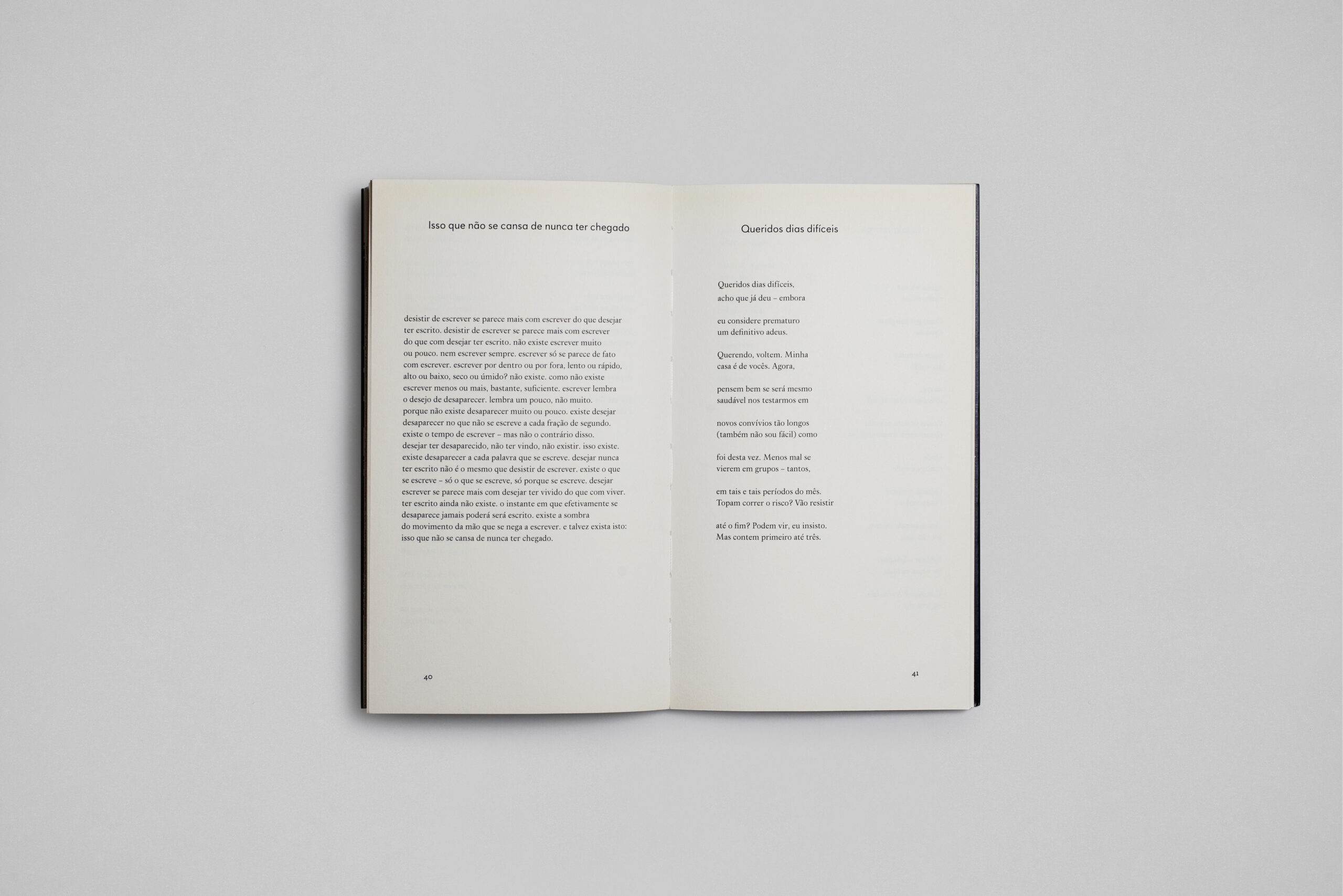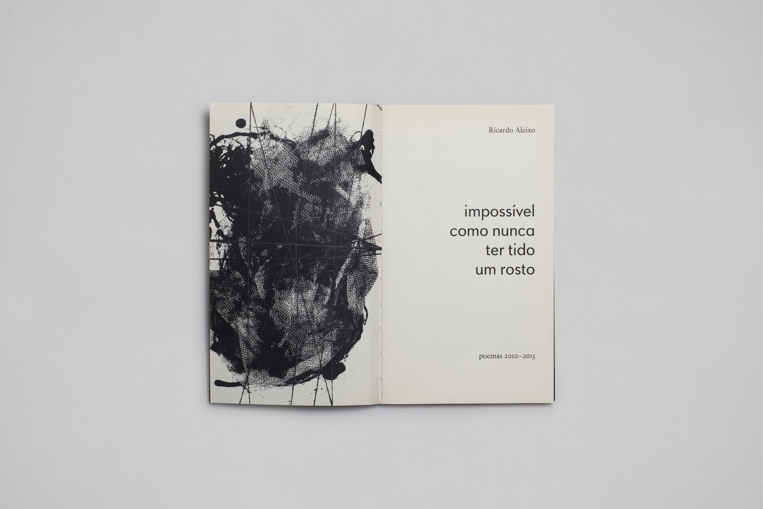 Livro de poemas de Ricardo Aleixo. A partir da aparente simetria do rosto, explorei a simetria do objeto-livro aberto para evidenciar a dissonância que se obtém ao se justapor a série de trabalhos visuais “As únicas coisas”, do próprio poeta: de um lado, em positivo, do outro, em negativo. O espelhamento das imagens que abrem e fecham as seções do livro permitiu que eu chegasse a composições dramáticas, especialmente ao juntar as linhas. A dicotomia contraste/convergência também é explorada nos diferentes estilos da família tipográfica Paideuma, com a qual o livro é composto.