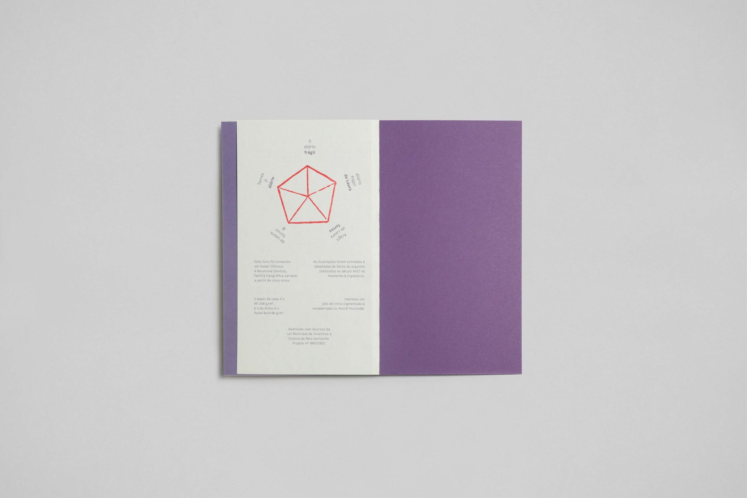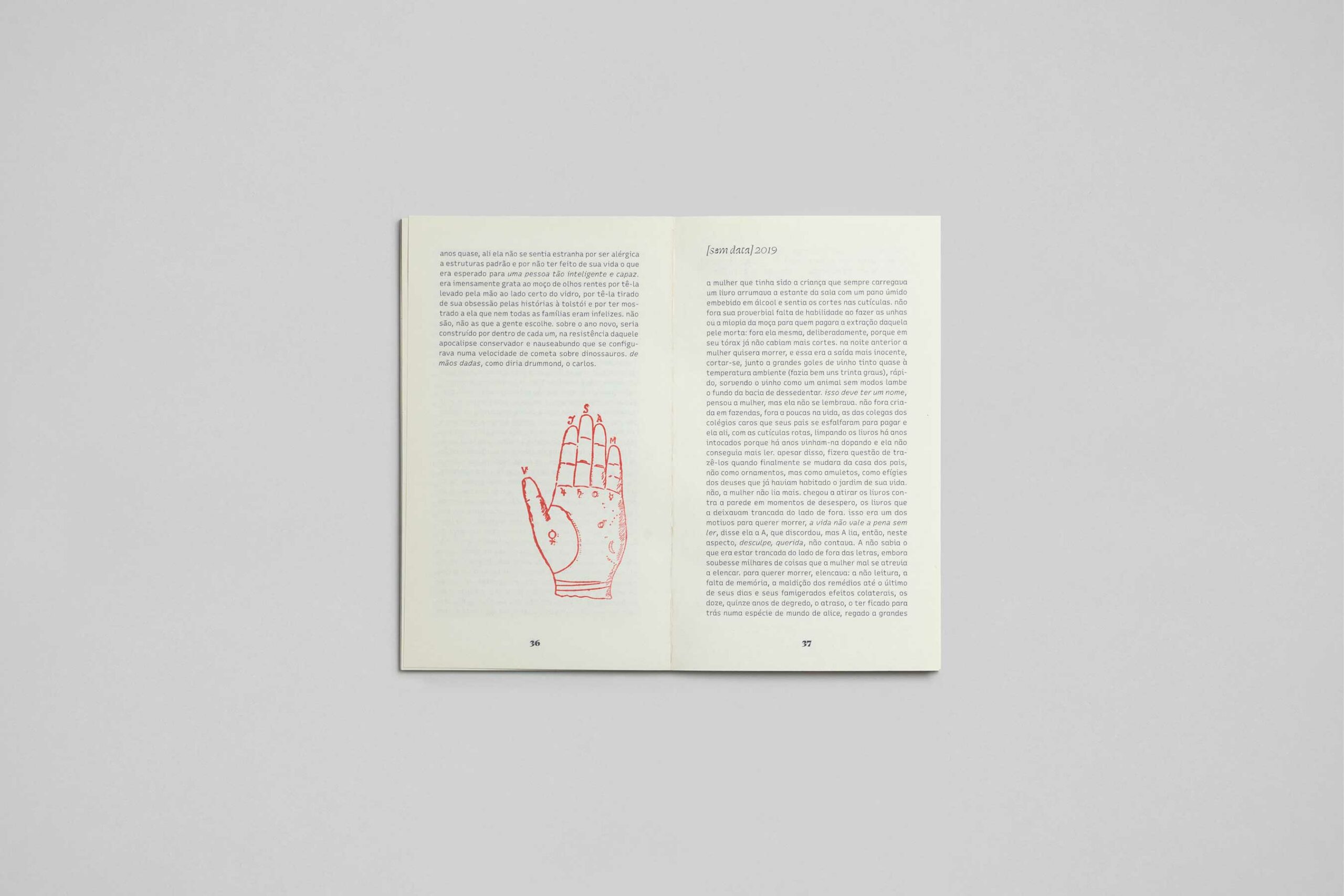 O romance narra, em fragmentos, a experiência de uma mulher com transtorno bipolar. O design se serve de fontes variáveis para refletir os sentimentos da protagonista. As ilustrações, extraídas de livros de alquimia do século XVII, foram adaptadas e transformadas em carimbos, impressos manualmente nas páginas. Veja também a identidade visual do projeto.