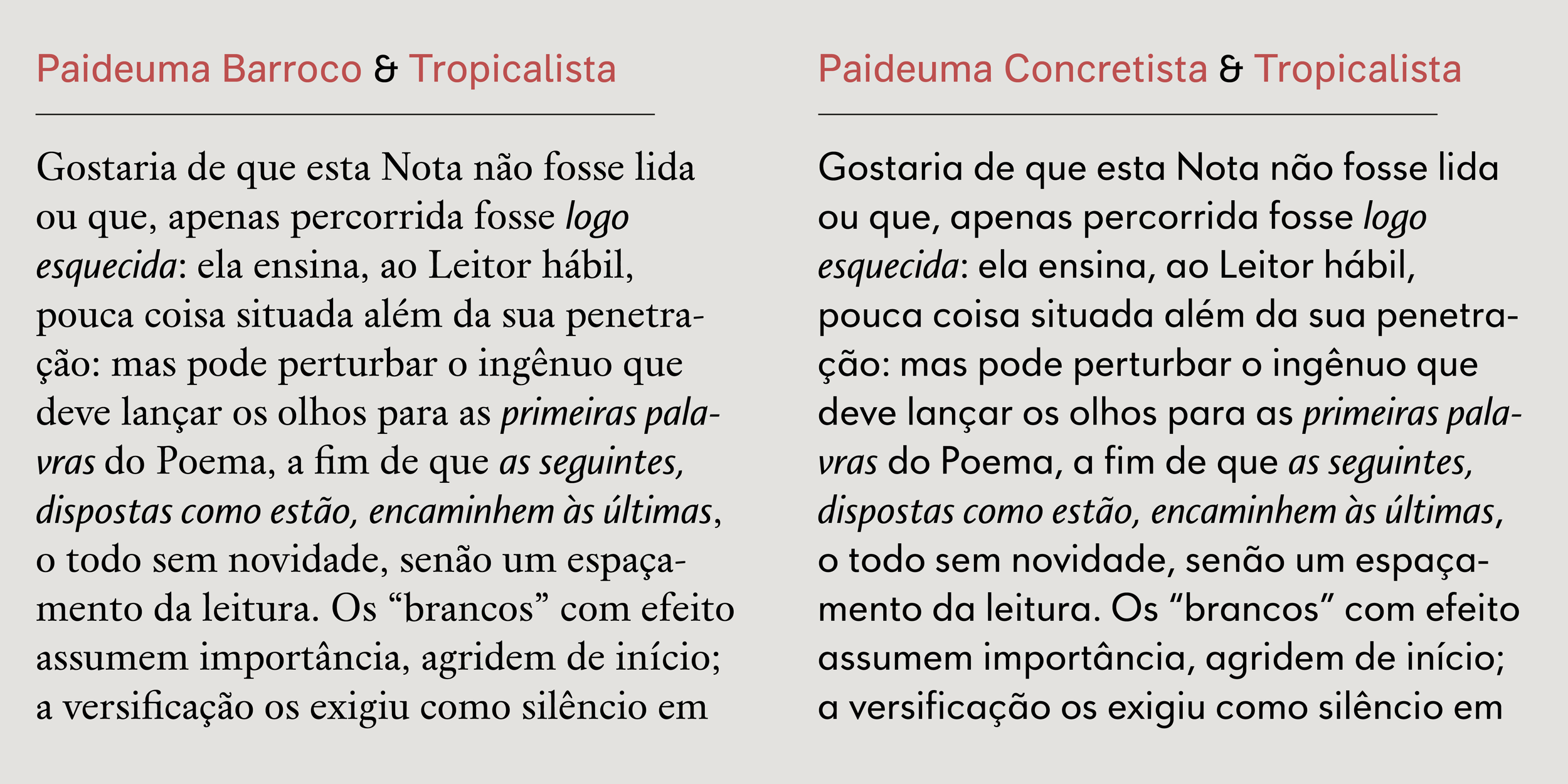 Nomeada pelo conceito de Leo Frobenius sobre a construção de significado cultural a partir da junção de diferentes artefatos e manifestações, Paideuma é uma família tipográfica multiforme que mapeia a evolução da modernidade na arte e literatura brasileiras, do período colonial à segunda metade do século XX. Conta com três estilos inter-relacionados: Barroco (serifado, inspirado em modelos do século XVII), Concretista (sem serifa, geométrico) e Tropicalista (itálico híbrido, combinável com os outros dois estilos).